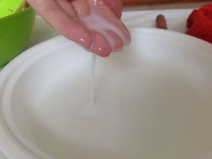 在玻璃碗内倒入100g的薯粉和125g的冷清水,搅拌均匀,粉水浓度要掌握的刚好喔!太稀皮容易破,太稠做出来的皮会很韧,口感不好.粉水的质量大概如图。