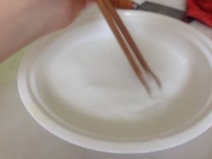 用筷子搅拌粉水,一边搅拌一边往里面加入沸水,记住是沸水喔!边搅边加入沸水的同时你会发现粉水凝固起来,当你发现已经有阻力,搅拌吃力的时候就要马上停止加沸水了,然后再搅拌一会,皮就完成了!