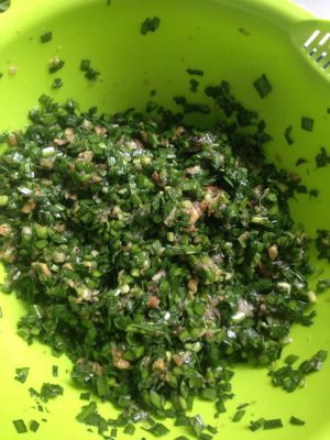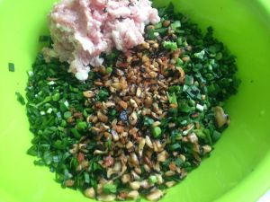 将炒好的香菇虾米干、肉碎和韭菜倒入一起,再根据自己的口味轻重加入调料(盐、味精、胡椒粉、麻油)