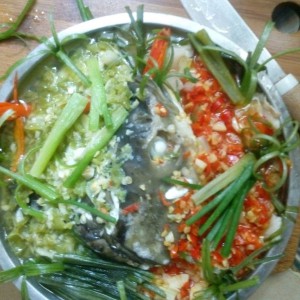 铺鱼。爆香辣椒倒在鱼上。葱段装饰。