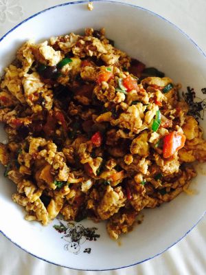 锅里再放少许油,葱花爆锅,将西红柿丁放进去。炒到西红柿不成型。放大酱(事先将大酱用水谢稀点。),小火熬酱。开锅后放入鸡蛋。美味营养的西红柿鸡蛋酱就做成了。