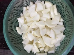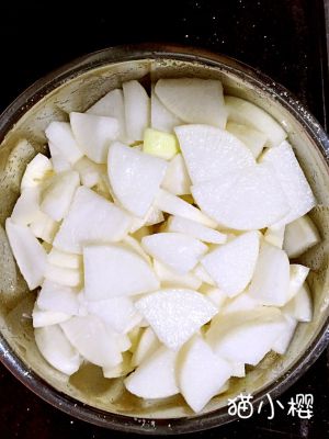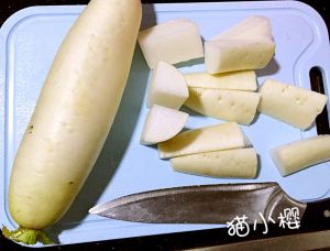 第二步:对切成四半。萝卜也是一分为四。切约1cm的厚度。