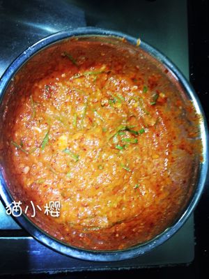 第八步:将准备好的材料放入料理机中,同时加入鱼露三勺、虾酱二勺辣椒粉70左右。