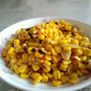将少许葱姜蒜倒入锅中翻炒,将玉米粒,枸杞倒入。