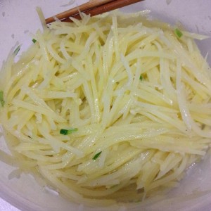 土豆刨丝泡在水里。锅里烧开水,下土豆丝,焯一分钟左右,捞出沥水装到盆里。