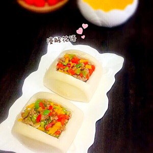 将炒好的彩椒牛肉馅填入馒头盒子中即可。
