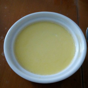 调好的鸡蛋奶液过筛两次,可以过滤出没融化的糖和蛋筋,然后再倒入布丁杯。