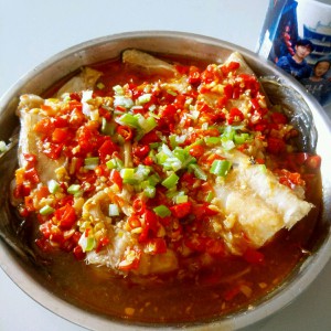 葱姜蒜、小米辣切末,热锅凉油,小火煸香之,放入3勺剁椒酱,煸炒片刻后,起锅均匀浇在鱼头上,入蒸锅大火蒸15分钟。