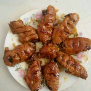 用剩余的油把拍扁的大蒜跟姜炒香,加入一碗凉开水,放盐,鸡精,五香粉,酱油,一碗可乐煮沸加入煎好的鸡翅煮至收汁就OK了,取出,摆盘,开吃