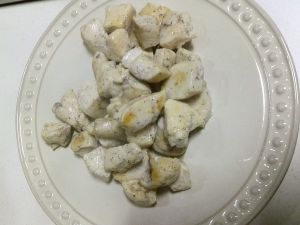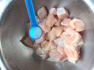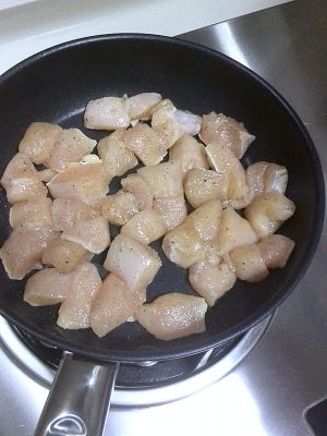 鸡胸肉洗净,去掉筋膜,切成小块,用适量的盐、少许的现磨黑胡椒拌匀,腌渍一小时以上;