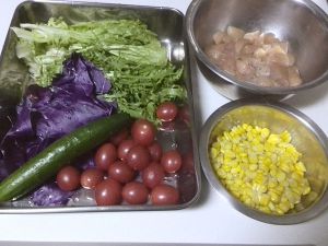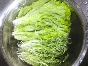 生菜、苦菊浸泡在放盐的清水里,十五分钟后洗净捞出,控干水分待用,
