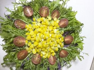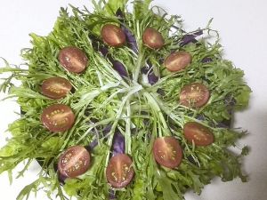取一平盘,生菜撕成大块,摆放在盘子底部,苦菊根部朝盘子中间,叶子朝外摆放在盘子四周,圣女果对切2半,摆放在盘子四周,