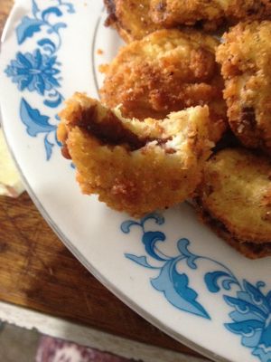 第三步把切好的地瓜夹上豆沙放到搅拌好的淀粉里然后拿出撒上面包渣。
