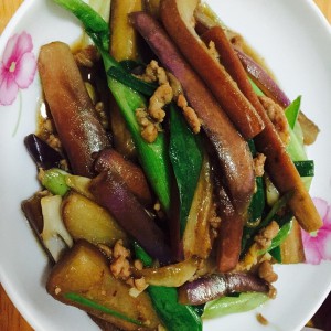 炒出香味后放茄子下去,茄子炒略软后加蒜苗段,倒入淀粉水,加锅盖稍微闷一会儿;