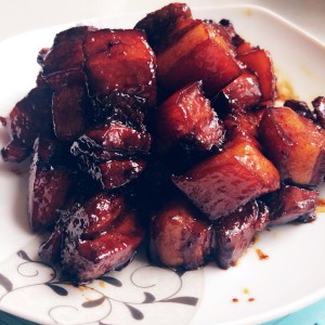 烧制一会打开锅就闻到扑鼻而来的花雕酒香,就可以加点热水,淹没肉,开始焖制吧,直制水收汁完毕。