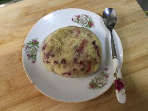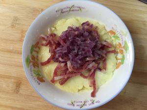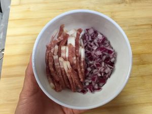 培根(火腿肠)切丝,洋葱切小丁,放微波炉打一分钟