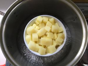 土豆洗净削皮切小丁上锅蒸熟(筷子能轻松戳烂就好)