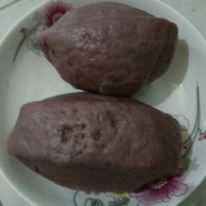 紫薯去皮上锅蒸熟,熟紫薯揉成泥,加入面粉,酵母加水慢慢倒入面粉上,边加水边揉面,到紫薯和面粉全部融合一起!如图!放入盆中盖上湿毛巾或湿纱布,等待面粉发酵!
