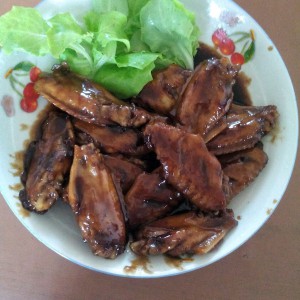 把八角和花椒从油中捞出来,放入鸡翅,料酒,酱油,可乐。然后大火收汁。