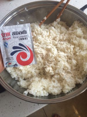 盖上锅盖,密封,可以多套两层塑料袋,然后放在28度左右的环境下放48小时,48小时后打开如果酒味不浓,不够甜,就原密封放入冰箱冷藏2-3天就可以了!