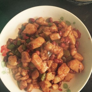 把炸花生米的油倒掉,倒入干净的油,等油热,下鸡丁,翻炒变白,盛到盘子待用,倒入莴笋翻炒半分钟,