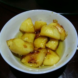 捞出苹果,控油。锅内入白糖,小火烧化,加苹果翻炒,盛盘。一