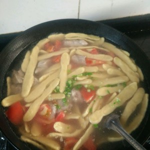 排骨下锅煮开,放番茄,撒葱花,加点点盐,加点点香油。放些面疙瘩就是番茄排骨面疙瘩汤。