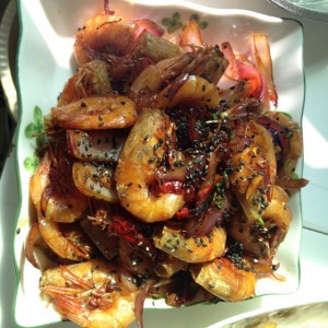 虾炸好后,多的油倒出,留少许,先放花椒,然后放入姜、蒜,最后放入洋葱、辣椒,炒出香味后放入虾、碗汁。