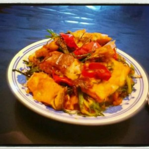鱼刺两面煎黄,放上姜片和剪碎的红辣椒,煎一下就可以放上别的料 。