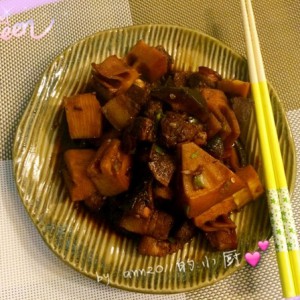 然后加入料酒、生抽、老抽、香料、花椒、干辣椒、姜片,加一碗水拌匀,盖上盖上汽后改小火烧制20分钟。