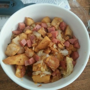 把切的馒头丁切放入鸡蛋中。在锅内放油,七分热,把沾有鸡蛋液的馒头丁翻炒,出锅。锅中放油,放入白菜,加盐,炒熟加入火腿,炒好的鸡蛋丁。出锅!