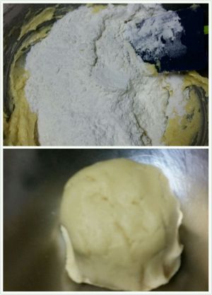 加入过筛的面粉,拌匀,和成面团。放入冰箱冷藏室冷藏30分钟。