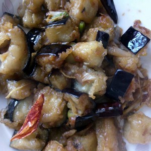 锅里放少许油,把葱,姜丝,辣椒,放入,再把炸好的茄子放入,放着酱油,加入少于的水,调料放入,反几下即可出锅。