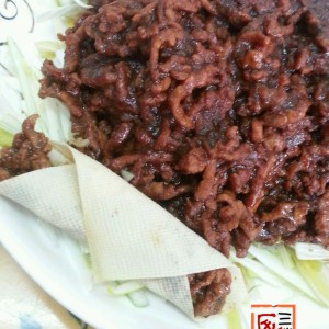 干豆腐放平,把葱丝肉丝一起卷到里面,哎呀我去,老阔了 o(╯□╰)o 当然你也可以放香菜,或是其他小青菜。