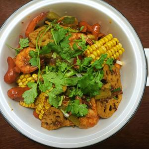 捞出虾头后,加入火锅底料,蒜,洋葱,花椒,八角,干辣椒用大火进行翻炒1分钟左右,加入一勺豆瓣,再翻炒1分钟