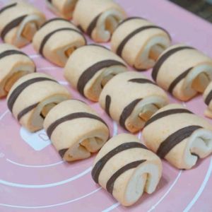 胡萝卜蒸熟,料理棒打碎,加入到面粉中,加入酵母粉和水揉成光滑面团,可可粉做黑面团,放温暖地方发酵至两倍大