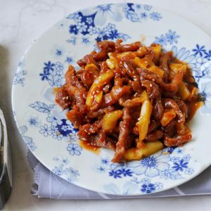 里脊肉切成粗条,放入碗里,加入淀粉、一个鸡蛋的蛋清、盐和适量水,抓匀腌制一会,不仅入味而且口感也嫩;