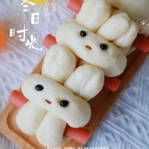 用筷子沾水戳个眼睛和嘴巴,塞上黑豆当眼睛,红米当嘴巴。