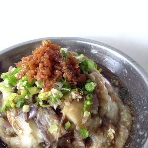 蒜末,葱末放茄子上,拿一个碗将调料放进,再倒入热锅爆香的潮汕菜脯,调匀淋在茄子上即可。