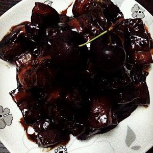 热油锅,倒入改刀的猪肉,加老抽上色,加入冰糖、生抽加水小火慢熬