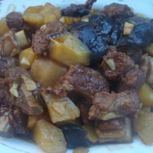 先把排骨用热水汆一下~锅中加油~下入葱段蒜片爆香~把排骨下入~加料酒胡椒粉~蚝油~酱油适量~糖~盐调味!~加水烧制~待水开了~加土豆和香菇~改中小火烧大约20到30分钟~在转大火收汁即成!~