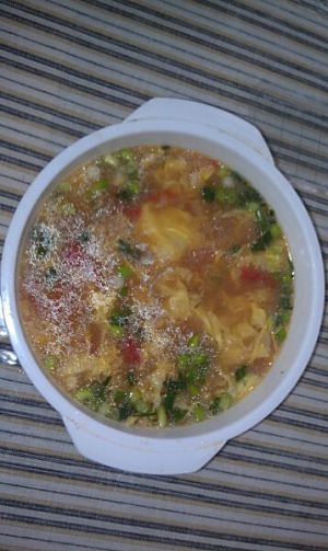 锅中放油烧热,下西红柿翻炒,下姜末翻炒,加高汤,如果没有高汤就加热水,汤开后加胡椒,鸡精