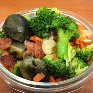 西兰花掰成小朵,洗净。尽量用手掰开,不用刀切,因为用刀切会掉很多碎屑,清理好麻烦。皮蛋切小块,胡萝卜切小丁,腊肠切片,大蒜切片。