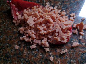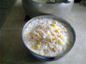 加入饭、玉米粒和火腿粒炖煮一会儿。