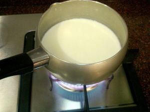 把牛奶煮沸后加入盐、糖、胡椒粉适量,搅拌均匀。