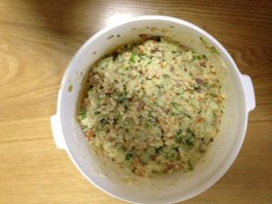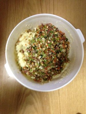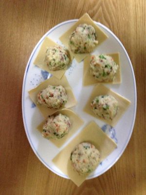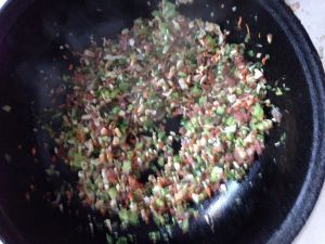 将胡罗卜,洋葱,香干,广味小香肠,青菜切碎,热油炒以上辅料,出锅前放食盐,酱油,热开水,鸡精,香油,美极鲜味汁