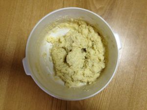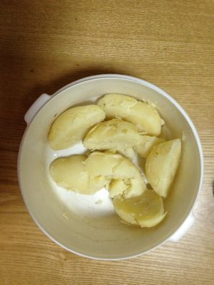 用勺子将土豆捻碎,成土豆泥,拌入黑胡椒粉,