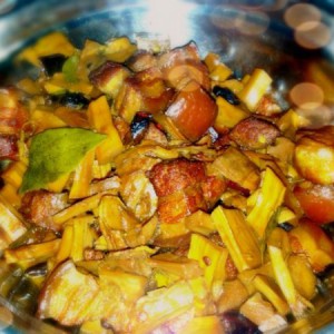 倒入老抽、料酒,加入一少糖。翻炒5分钟。