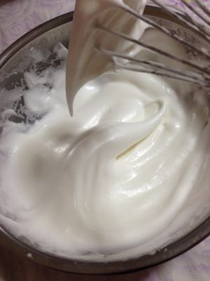 蛋白滴入柠檬汁。打至出大泡的时候加一次白糖。再打至小泡的时候加一次白糖。最后打至出现纹路的时候加入剩下的白糖。把蛋白打至把盆倒扣也不会掉下的程度。手打,十分钟左右。