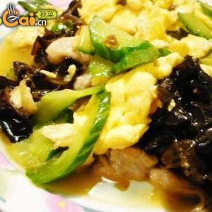 不用等全部结成一块一块蒜下锅,出香味,下黄瓜片,黑木耳,鸡蛋,里脊炒一两分钟左右~ 下少许水~然后盐,味精,水淀粉勾薄薄的芡出锅~